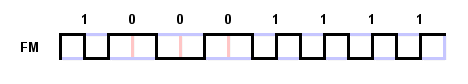 The first common encoding system for recording digital data on magnetic media was frequency modulation, of course abbreviated FM. This is a simple scheme, where a one is recorded as two consecutive flux reversals, and a zero is recorded as a flux reversal followed by no flux reversal. This can also be thought of as follows: a flux reversal is made at the start of each bit to represent the clock, and then an additional reversal is added in the middle of each bit for a one, while the additional reversal is omitted for a zero.