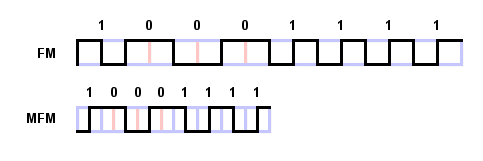 A refinement of the FM encoding method is modified frequency modulation, or MFM. MFM improves on FM by reducing the number of flux reversals inserted just for the clock. Instead of inserting a clock reversal at the start of every bit, one is inserted only between consecutive zeros. When a 1 is involved there is already a reversal (in the middle of the bit) so additional clocking reversals are not needed. When a zero is preceded by a 1, we similarly know there was recently a reversal and another is not needed. Only long strings of zeros have to be "broken up" by adding clocking reversals.